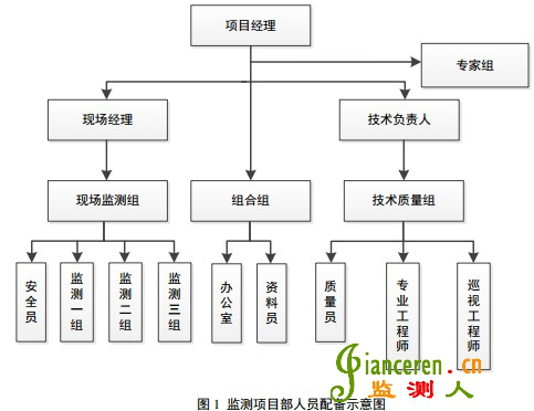 在敘述完監(jiān)測技術(shù)保證措施后,本部分應(yīng)對(duì)如何合理優(yōu)化配置相關(guān)人員,以滿足監(jiān)測工作要求, 同時(shí)兼顧經(jīng)濟(jì)原則進(jìn)行詳細(xì)介紹。建議本部分參考投標(biāo)文件中相關(guān)人員信息,通過項(xiàng)目部人員組織架構(gòu)圖與人員信息列表的形式進(jìn)行編寫,具體形式可參考圖 3.1 及表 3.5。